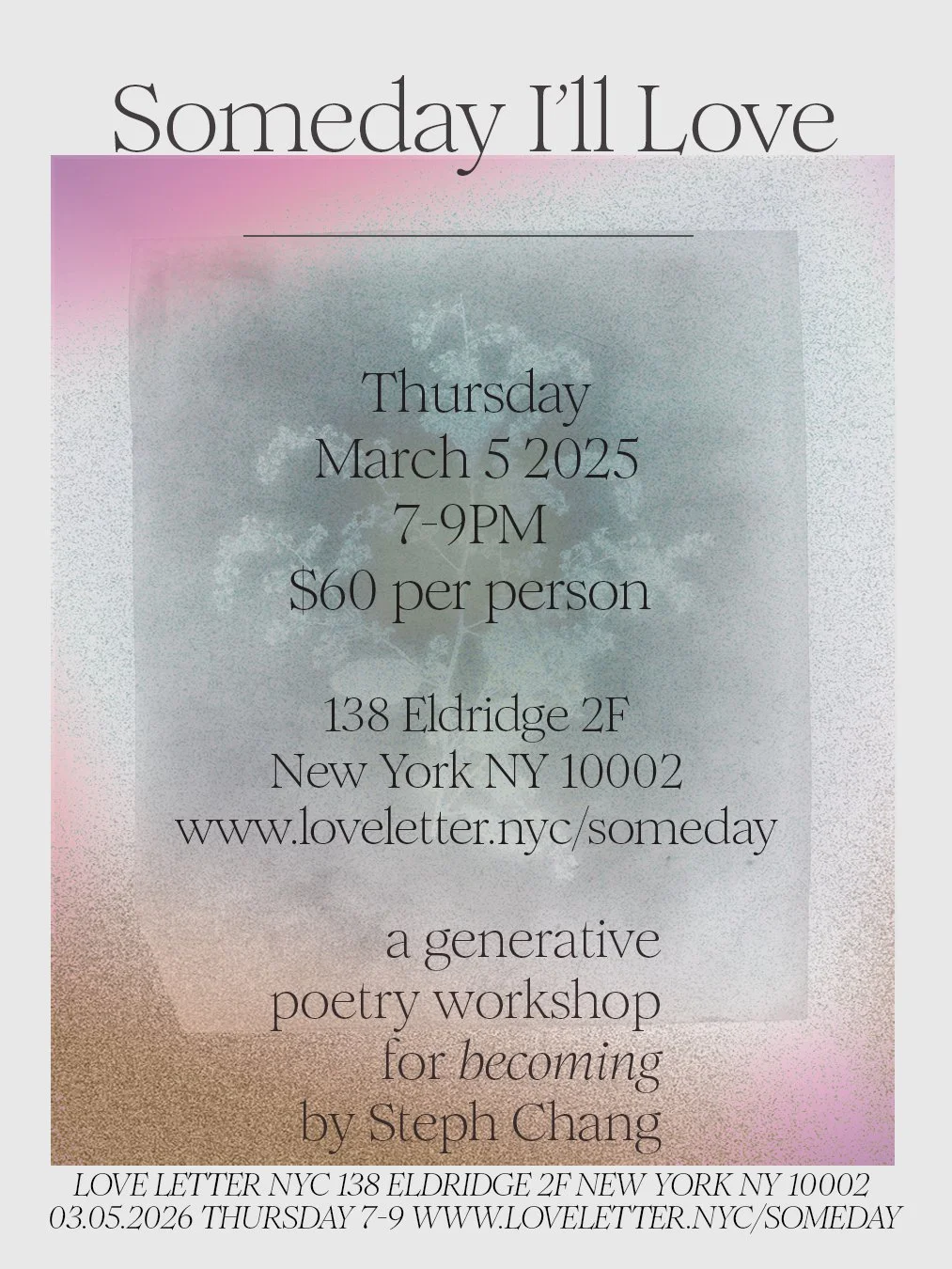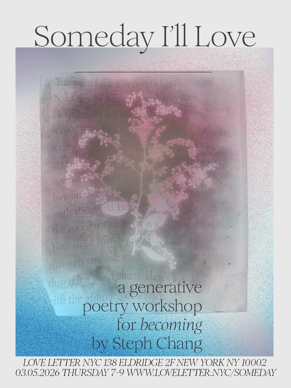 In this generative in-person poetry workshop led by Steph Chang, we will write toward self-love as second chance. As the world you found and the one you left behind. As rediscovery. As the afternoon sun that echoes golden against any storm.